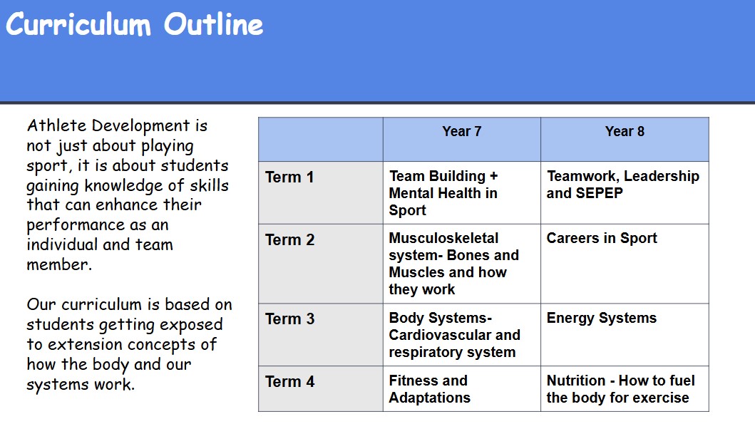Designed to encourage young, passionate enthusiastic students in Year 7 to develop as a well rounded athlete.